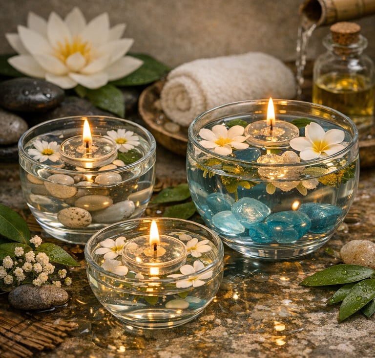 Velas en agua con pétalos, cristales energéticos, caracoles marinos y piedras lujosas que simbolizan calma, abundancia y protección.